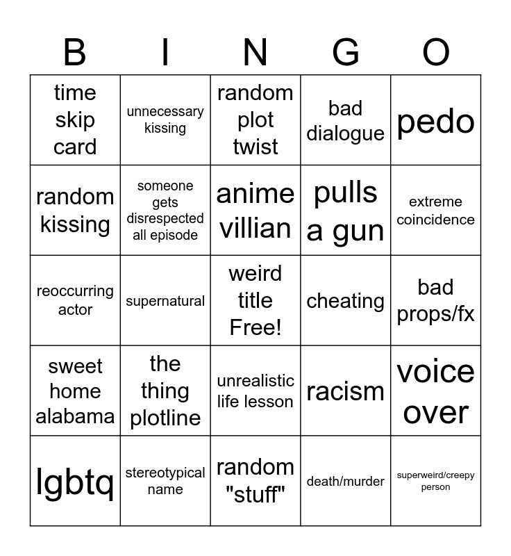This bingo card has a free space and 24 words: the thing plotline, stereotypical name, anime villian, lgbtq, pedo, time skip card, random kissing, unnecessary kissing, cheating, unrealistic life lesson, pulls a gun, reoccurring actor, racism, voice over, someone gets disrespected all episode, death/murder, bad props/fx, random plot twist, extreme coincidence, supernatural, superweird/creepy person, sweet home alabama, bad dialogue and random "stuff".
