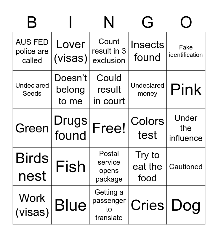 This bingo card has a free space and 33 words: Blame family member, No drugs found, Drugs found, Undeclared Cigarette, Birds nest, Doesn’t belong to me, Fake identification, Work (visas), Lover (visas), Frisk search, Could result in court, Count result in 3 exclusion, I didn’t fill out the card, Wee woo wee woo, Colors test, Pink, Blue, Green, Fish, Try to eat the food, Postal service opens package, Taxidermy, AUS FED police are called, Under the influence, Getting a passenger to translate, Dog, Insects found, Undeclared money, Undeclared Seeds, Cautioned, $ fine, Cries and Towel.