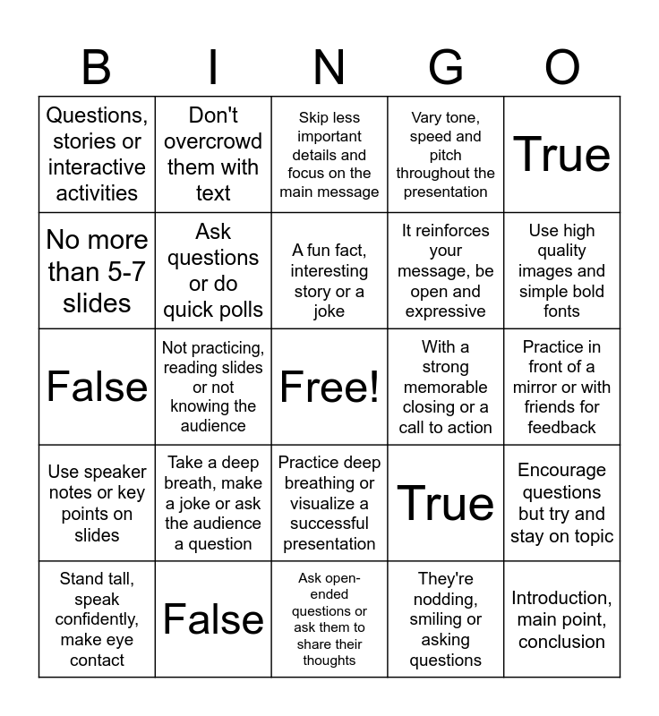 This bingo card has a free space and 24 words: Take a deep breath, make a joke or ask the audience a question, False, A fun fact, interesting story or a joke, Stand tall, speak confidently, make eye contact, True, Questions, stories or interactive activities, No more than 5-7 slides, Don't overcrowd them with text, With a strong memorable closing or a call to action, Practice deep breathing or visualize a successful presentation, It reinforces your message, be open and expressive, False, True, Encourage questions but try and stay on topic, Ask questions or do quick polls, They're nodding, smiling or asking questions, Practice in front of a mirror or with friends for feedback, Skip less important details and focus on the main message, Use high quality images and simple bold fonts, Not practicing, reading slides or not knowing the audience, Introduction, main point, conclusion, Use speaker notes or key points on slides, Vary tone, speed and pitch throughout the presentation and Ask open-ended questions or ask them to share their thoughts.
