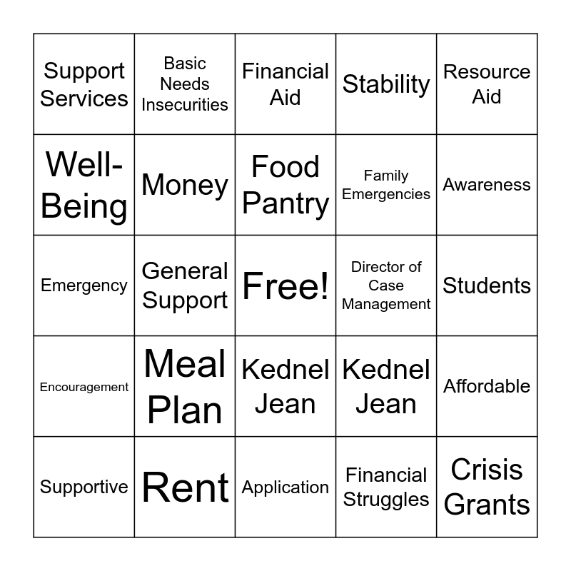 This bingo card has a free space and 89 words: Clark Hall, Director of Case Management, Kednel Jean, SJSU Cares, Support, Basic needs, Solutions, Housing Insecurity, Food Insecurity, Nutritious food, Struggle, Meals, Affordable, Students, Homelessness, Food Pantry, Resource, Student Union, CalFresh, EBT Card, Assistance, Appointments, Application, Meal Plan, Emergency, Rent, Hardships, Disasters, Short-term, Rehousing, Stability, General Support, Mental Health, Support Services, Nutrition, Financial Aid, Well-Being, Utilization, Awareness, Supportive, Encouragement, Success, SJSU Cares, Clark Hall, Kednel Jean, Director of Case Management, Student Affairs Case Manager, Food Pantry, Students, Basic Needs Insecurities, Proactive Solutions, Challenges, Food Insecurity, Housing Insecurity, Meals, Healthy Lifestyle, Afford, Situations, Financial Instability, Stable Housing, Homelessness, Resource, Student Union, Food Pantry, CalFresh, EBT Card, Groceries, Appointment, Application, Meal Plan, Crisis Grants, Hardships, Disasters, Family Emergencies, Money, Financial Struggles, Emergency Housing, Rapid Rehousing Program, Financial Crises, General Support, Resource Aid, Supportive Community, Instagram Ad, Staff Manuel One Sheet, Financial Aid, Sickness, Healthcare, Free money and Water.