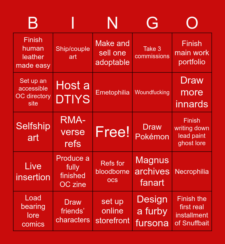 This bingo card has a free space and 24 words: Produce a fully finished OC zine, Draw friends’ characters, Emetophilia, Load bearing lore comics, Finish main work portfolio, Finish human leather made easy, Set up an accessible OC directory site, Ship/couple art, Draw Pokémon, Refs for bloodborne ocs, Woundfucking, Selfship art, Magnus archives fanart, Necrophilia, Host a DTIYS, Design a furby fursona, Finish writing down lead paint ghost lore, Make and sell one adoptable, Draw more innards, RMA-verse refs, Finish the first real installment of Snuffbait, Live insertion, Take 3 commissions and set up online storefront.