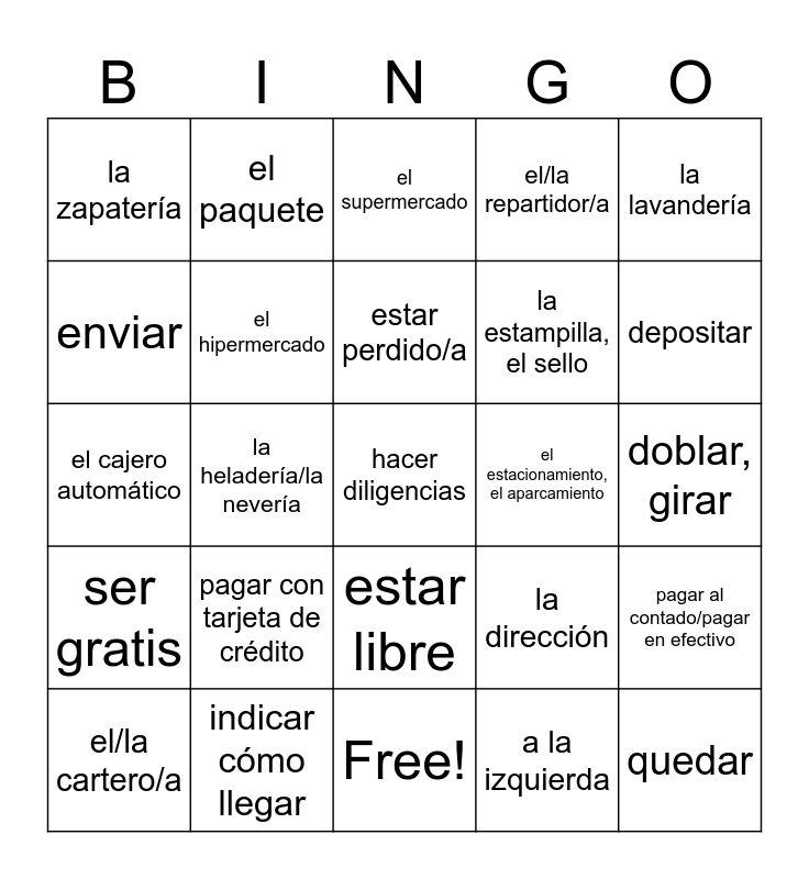 This bingo card has 31 words: Free!, la carnicería, la heladería/la nevería, la panadería, la zapatería, el supermercado, el hipermercado, la dirección, el estacionamiento, el aparcamiento, a la izquierda, doblar, girar, hacer diligencias, quedar, ahorrar, depositar, firmar, pagar al contado/pagar en efectivo, pagar con tarjeta de crédito, ser gratis, estar libre, la lavandería, la peluquería, el salón de belleza, el/la cartero/a, el paquete, la estampilla, el sello, enviar, el/la repartidor/a, el cajero automático, indicar cómo llegar, estar perdido/a and norte, sur, este, oeste.