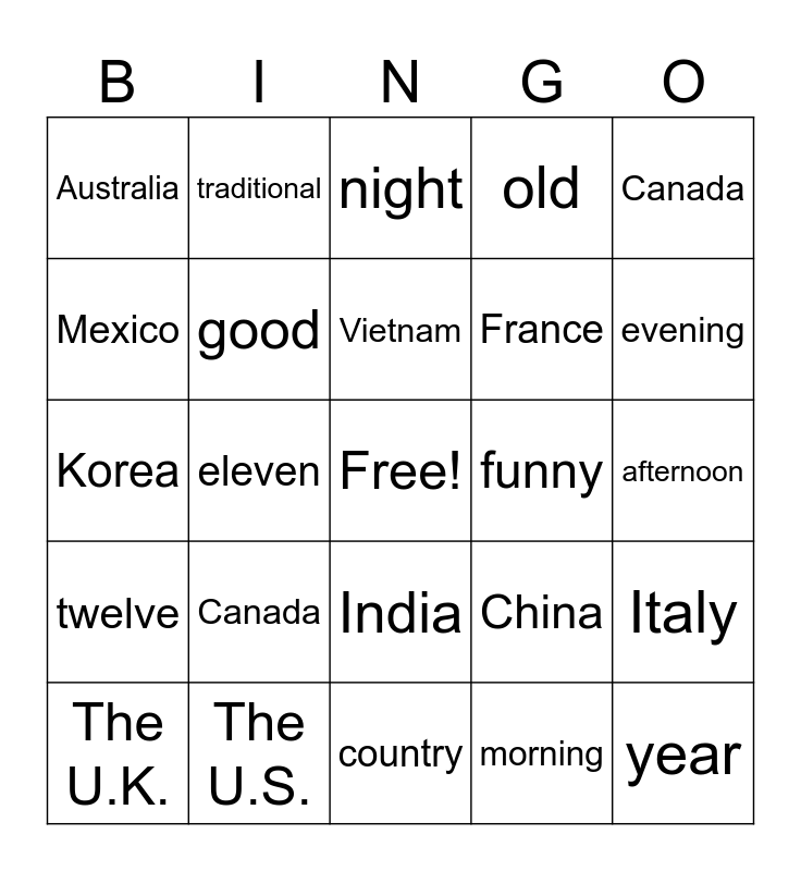 This bingo card has a free space and 24 words: Canada, The U.S., Vietnam, The U.K., Canada, Australia, Mexico, traditional, funny, India, France, Korea, China, Italy, good, morning, afternoon, night, evening, eleven, year, twelve, old and country.