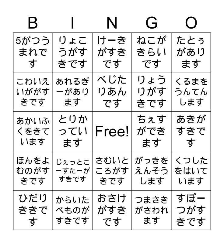 Where to Who with How by? | L15 Review Bingo | ひらがなBingo | find who ... (short form, present tense) | すぽーつ と しゅみ