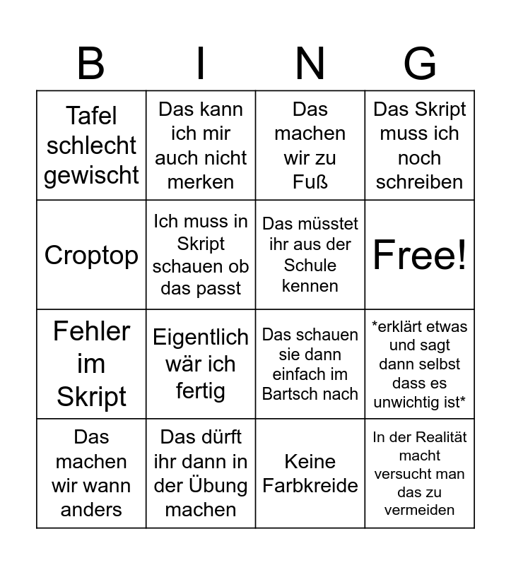 This bingo card has 17 words: Keine Farbkreide, Das machen wir wann anders, Das machen wir zu Fuß, Tafel schlecht gewischt, Eigentlich wär ich fertig, Das Skript muss ich noch schreiben, *erklärt etwas und sagt dann selbst dass es unwichtig ist*, Das müsstet ihr aus der Schule kennen, Free!, Ich muss in Skript schauen ob das passt, Das dürft ihr dann in der Übung machen, Das schauen sie dann einfach im Bartsch nach, Croptop, Das kann ich mir auch nicht merken, Fehler im Skript, Überzieht and In der Realität macht versucht man das zu vermeiden.