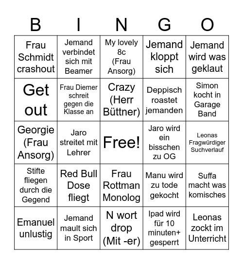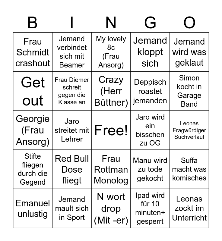 This bingo card has a free space and 24 words: Red Bull Dose fliegt, Jemand mault sich in Sport, Crazy (Herr Büttner), Emanuel unlustig, Jemand wird was geklaut, Frau Schmidt crashout, Get out, Jemand verbindet sich mit Beamer, Jaro wird ein bisschen zu OG, Frau Rottman Monolog, Deppisch roastet jemanden, Georgie (Frau Ansorg), Manu wird zu tode gekocht, Suffa macht was komisches, Frau Diemer schreit gegen die Klasse an, Ipad wird für 10 minuten+ gesperrt, Leonas Fragwürdiger Suchverlauf, My lovely 8c (Frau Ansorg), Simon kocht in Garage Band, Jaro streitet mit Lehrer, Leonas zockt im Unterricht, Stifte fliegen durch die Gegend, Jemand kloppt sich and N wort drop (Mit -er).