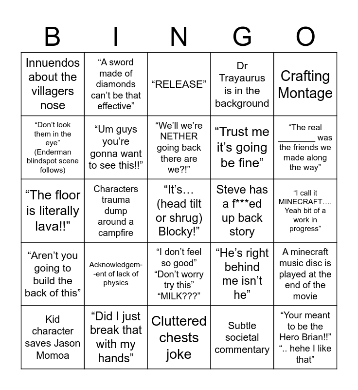 This bingo card has a free space and 24 words: Acknowledgem--ent of lack of physics, “Did I just break that with my hands”, “We’ll we’re NETHER going back there are we?!”, Kid character saves Jason Momoa, Crafting Montage, Innuendos about the villagers nose, “Don’t look them in the eye” (Enderman blindspot scene follows), “A sword made of diamonds can’t be that effective”, Steve has a f***ed up back story, “I don’t feel so good” “Don’t worry try this” “MILK???”, “Trust me it’s going be fine”, “The floor is literally lava!!”, “He’s right behind me isn’t he”, A minecraft music disc is played at the end of the movie, “Um guys you’re gonna want to see this!!”, Subtle societal commentary, “I call it MINECRAFT…. Yeah bit of a work in progress”, “RELEASE”, “The real ________ was the friends we made along the way”, Characters trauma dump around a campfire, “Your meant to be the Hero Brian!!” “.. hehe I like that”, “Aren’t you going to build the back of this”, Dr Trayaurus is in the background and Cluttered chests joke.