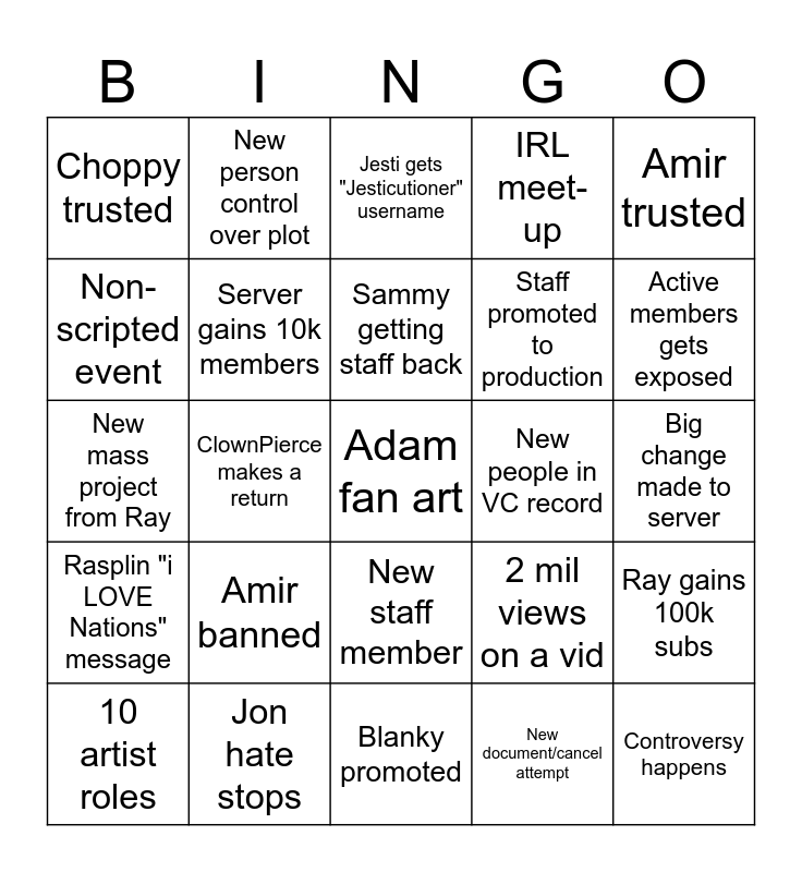This bingo card has 25 words: Amir banned, Blanky promoted, Sammy getting staff back, 10 artist roles, Amir trusted, Choppy trusted, Non-scripted event, New person control over plot, New people in VC record, New staff member, Staff promoted to production, New mass project from Ray, 2 mil views on a vid, Ray gains 100k subs, Server gains 10k members, Controversy happens, Big change made to server, Jesti gets "Jesticutioner" username, Active members gets exposed, ClownPierce makes a return, Adam fan art, Jon hate stops, Rasplin "i LOVE Nations" message, IRL meet-up and New document/cancel attempt.