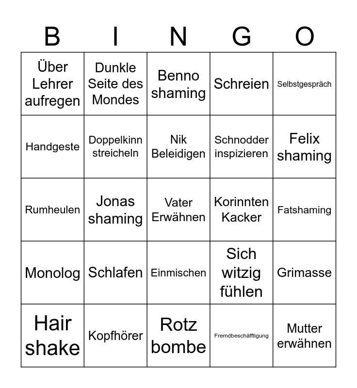This bingo card has a free space and 24 words: Schlafen, Kopfhörer, Nik Beleidigen, Hair shake, Selbstgespräch, Über Lehrer aufregen, Handgeste, Dunkle Seite des Mondes, Korinnten Kacker, Einmischen, Schnodder inspizieren, Rumheulen, Sich witzig fühlen, Grimasse, Doppelkinn streicheln, Fremdbeschäfftigung, Fatshaming, Benno shaming, Felix shaming, Jonas shaming, Mutter erwähnen, Monolog, Schreien and Rotz bombe.