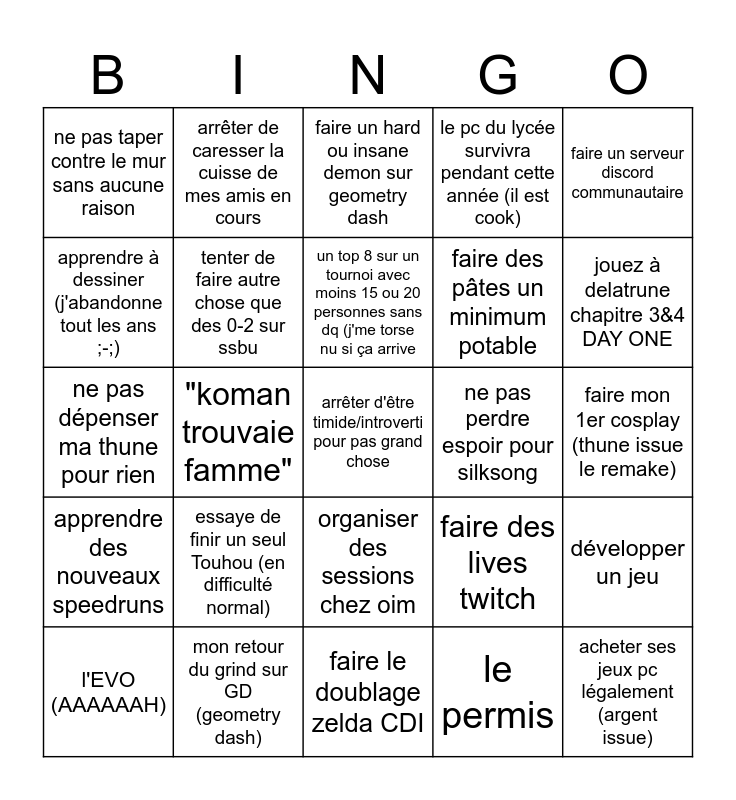This bingo card has a free space and 24 words: essaye de finir un seul Touhou (en difficulté normal), mon retour du grind sur GD (geometry dash), un top 8 sur un tournoi avec moins 15 ou 20 personnes sans dq (j'me torse nu si ça arrive, l'EVO (AAAAAAH), faire un serveur discord communautaire, ne pas taper contre le mur sans aucune raison, apprendre à dessiner (j'abandonne tout les ans ;-;), arrêter de caresser la cuisse de mes amis en cours, ne pas perdre espoir pour silksong, organiser des sessions chez oim, faire des pâtes un minimum potable, ne pas dépenser ma thune pour rien, faire des lives twitch, développer un jeu, tenter de faire autre chose que des 0-2 sur ssbu, le permis, faire mon 1er cosplay (thune issue le remake), faire un hard ou insane demon sur geometry dash, jouez à delatrune chapitre 3&4 DAY ONE, "koman trouvaie famme", acheter ses jeux pc légalement (argent issue), apprendre des nouveaux speedruns, le pc du lycée survivra pendant cette année (il est cook) and faire le doublage zelda CDI.