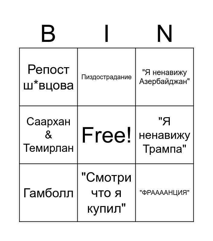 This bingo card has a free space and 8 words: "Я ненавижу Трампа", "Я ненавижу Азербайджан", Пиздострадание, Гамболл, Репост ш*вцова, "ФРААААНЦИЯ", Саархан & Темирлан and "Смотри что я купил".