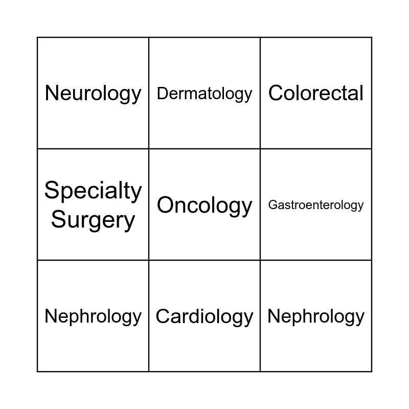 This bingo card has 21 words: Psychiatry, Orthopedics, Colorectal, Diabetic, Cardiology, Nephrology, Neurology, Dermatology, Endocrinology, Oncology, General Surgery, Specialty Surgery, Urology, Rheumatology, Nephrology, Cardiology, Pulmonology, Infectious Disease, Gastroenterology, Critical Care and Pediatrics.