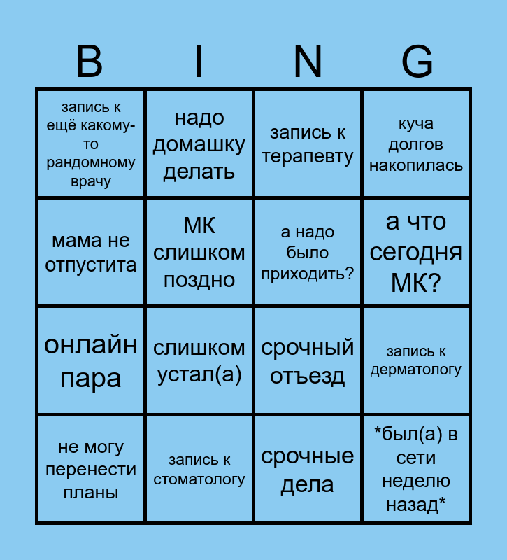 This bingo card has 16 words: запись к стоматологу, запись к дерматологу, запись к терапевту, запись к ещё какому-то рандомному врачу, онлайн пара, надо домашку делать, срочный отъезд, срочные дела, мама не отпустита, МК слишком поздно, не могу перенести планы, куча долгов накопилась, слишком устал(а), а что сегодня МК?, а надо было приходить? and *был(а) в сети неделю назад*.