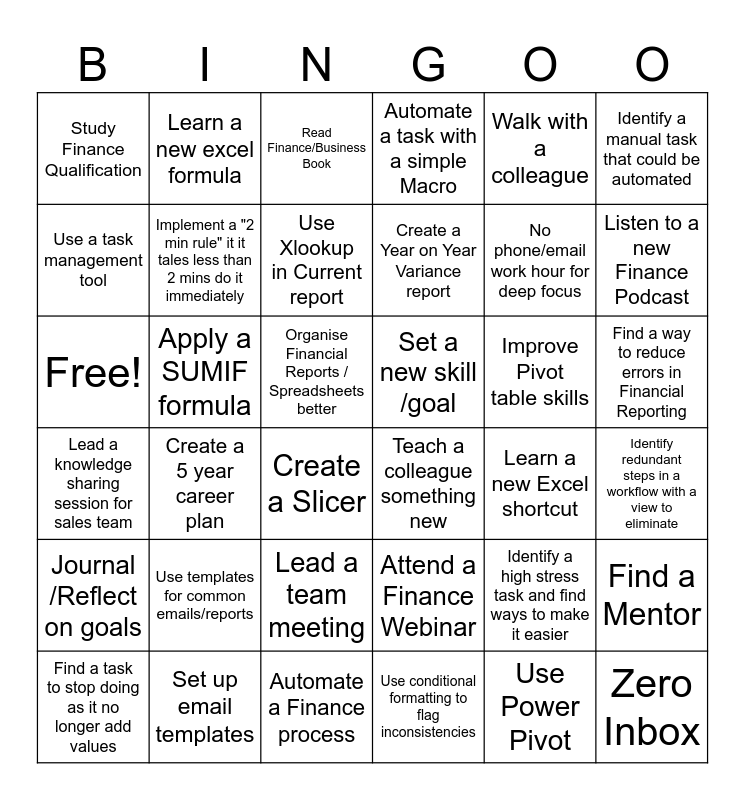 This bingo card has 36 words: Attend a Finance Webinar, Lead a team meeting, Use conditional formatting to flag inconsistencies, Use a task management tool, Lead a knowledge sharing session for sales team, Set a new skill /goal, Implement a "2 min rule" it it tales less than 2 mins do it immediately, Automate a Finance process, Walk with a colleague, Identify a high stress task and find ways to make it easier, Listen to a new Finance Podcast, Automate a task with a simple Macro, Find a Mentor, Apply a SUMIF formula, Create a Year on Year Variance report, Study Finance Qualification, Journal /Reflect on goals, Improve Pivot table skills, Free!, Read Finance/Business Book, Organise Financial Reports / Spreadsheets better, Create a 5 year career plan, Teach a colleague something new, Create a Slicer, Learn a new Excel shortcut, Learn a new excel formula, No phone/email work hour for deep focus, Set up email templates, Use Xlookup in Current report, Identify a manual task that could be automated, Zero Inbox, Find a task to stop doing as it no longer add values, Identify redundant steps in a workflow with a view to eliminate, Find a way to reduce errors in Financial Reporting, Use templates for common emails/reports and Use Power Pivot.