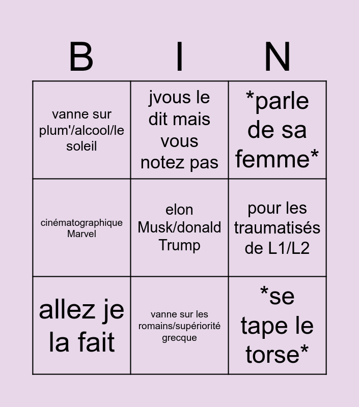 This bingo card has a free space and 9 words: allez je la fait, *parle de sa femme*, jvous le dit mais vous notez pas, cinématographique Marvel, vanne sur plum'/alcool/le soleil, pour les traumatisés de L1/L2, *se tape le torse*, rire exagéré à une vanne pourri and vanne sur les romains/supériorité grecque.
