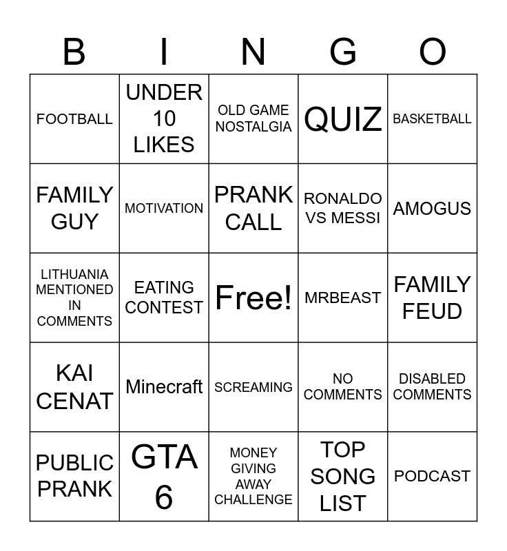 This bingo card has a free space and 24 words: Minecraft, GTA 6, PRANK CALL, PUBLIC PRANK, BASKETBALL, FOOTBALL, FAMILY GUY, UNDER 10 LIKES, MRBEAST, SCREAMING, RONALDO VS MESSI, LITHUANIA MENTIONED IN COMMENTS, NO COMMENTS, DISABLED COMMENTS, MOTIVATION, TOP SONG LIST, FAMILY FEUD, OLD GAME NOSTALGIA, AMOGUS, EATING CONTEST, PODCAST, KAI CENAT, QUIZ and MONEY GIVING AWAY CHALLENGE.