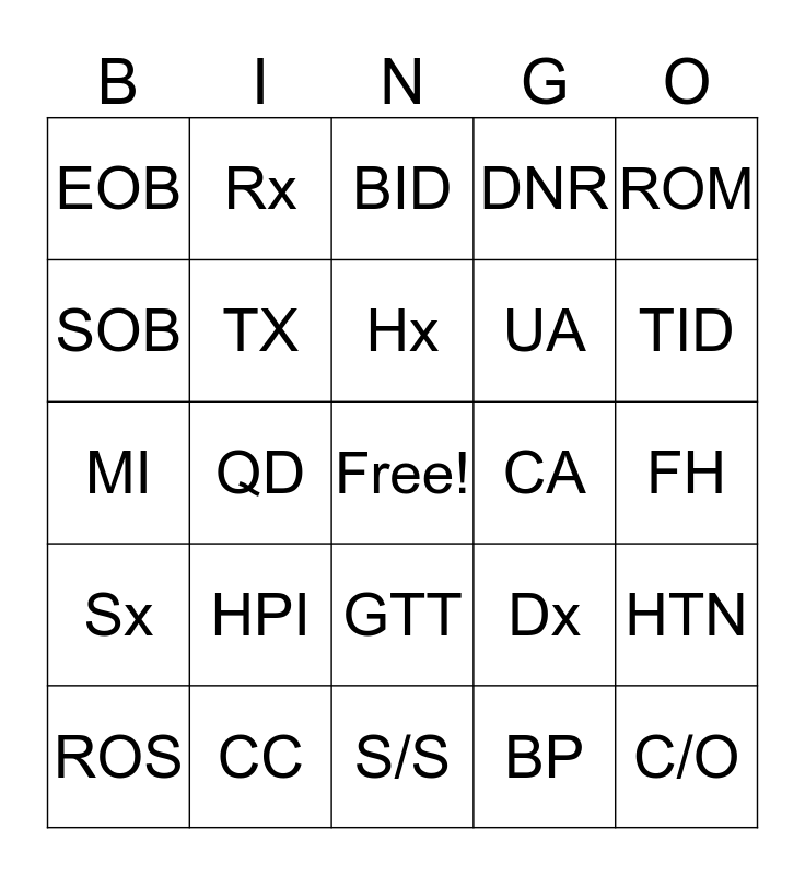 This bingo card has a free space and 24 words: HPI, CC, Hx, ROS, ROM, EOB, SOB, Rx, CA, GTT, UA, MI, Dx, HTN, TX, BP, FH, BID, TID, QD, C/O, Sx, DNR and S/S.