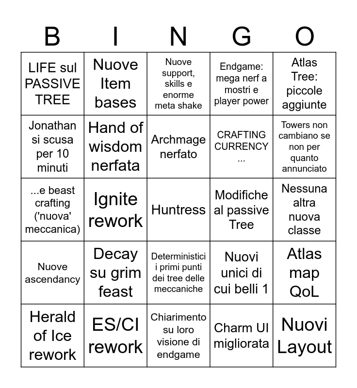 This bingo card has a free space and 24 words: Decay su grim feast, ES/CI rework, Archmage nerfato, Herald of Ice rework, Atlas Tree: piccole aggiunte, LIFE sul PASSIVE TREE, Jonathan si scusa per 10 minuti, Nuove Item bases, Modifiche al passive Tree, Deterministici i primi punti dei tree delle meccaniche, CRAFTING CURRENCY ..., ...e beast crafting ('nuova' meccanica), Nuovi unici di cui belli 1, Atlas map QoL, Hand of wisdom nerfata, Charm UI migliorata, Nessuna altra nuova classe, Nuove support, skills e enorme meta shake, Towers non cambiano se non per quanto annunciato, Ignite rework, Nuovi Layout, Nuove ascendancy, Endgame: mega nerf a mostri e player power and Chiarimento su loro visione di endgame.