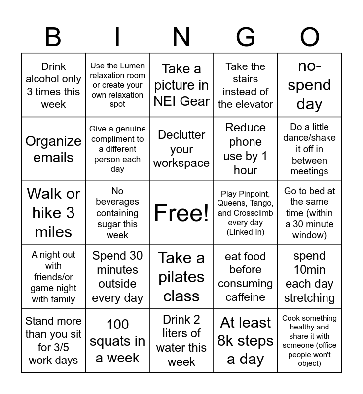 This bingo card has a free space and 32 words: At least 8k steps a day, 20-minute stretching session 3 times this week, No beverages containing sugar this week, Eat a different fruit or veggies all week one for each color of the rainbow, A night out with friends/or game night with family, Give a genuine compliment to a different person each day, no-spend day, spend 10min each day stretching, Use the Lumen relaxation room or create your own relaxation spot, 100k steps, Declutter your workspace, Take a picture in NEI Gear, Do a healthy activity with a coworker, Play at least 3 NYT games per day, Play Pinpoint, Queens, Tango, and Crossclimb every day (Linked In), Go on a mini walk during part of your lunch break, Stand more than you sit for 3/5 work days, Walk or hike 3 miles, Take a pilates class, Spend 30 minutes outside every day, eat food before consuming caffeine, Include a fruit or veggie in every meal 3x this week, Go to bed at the same time (within a 30 minute window), 100 squats in a week, Cook something healthy and share it with someone (office people won't object), Take the stairs instead of the elevator, Reduce phone use by 1 hour, Organize emails, Drink alcohol only 3 times this week, Drink 2 liters of water this week, Read and share a new article (any topic) and Do a little dance/shake it off in between meetings.