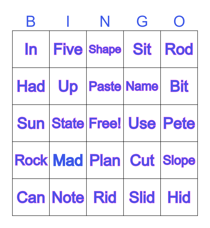 This bingo card has a free space and 24 words: Mad, Note, Paste, Can, Rod, In, Had, Five, Use, Plan, Name, Sun, Cut, Slope, Up, Slid, Pete, Shape, Bit, State, Hid, Rock, Sit and Rid.