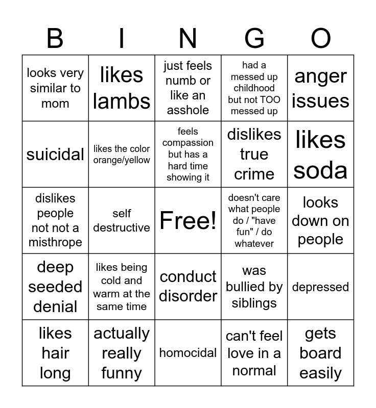 This bingo card has a free space and 39 words: tired, mommy issues, asexual, likes the color orange/yellow, likes hair long, conduct disorder, feels compassion but has a hard time showing it, asocial, anger issues, deep seeded denial, self destructive, had a messed up childhood but not TOO messed up, gets board easily, looks down on people, doesn't care what people do / "have fun" / do whatever, likes being cold and warm at the same time, smokes, looks very similar to mom, lots of siblings, was bullied by siblings, suicidal, homocidal, dislikes true crime, likes soda, too tired to care 88% of the time, likes rabbits, good at drawing, extreme fear of anything sexual at all, dislikes blood but isn't really scared of it, likes lambs, likes dogs, doesn't cry easily, just feels numb or like an asshole, actually really funny, can't feel love in a normal, wears mixed up socks, depressed, dislikes people not not a misthrope and feels a connection to angels / maybe angelkin.