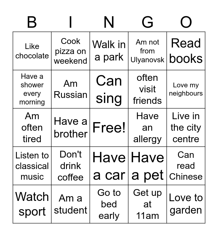 This bingo card has a free space and 24 words: Don't drink coffee, Am a student, Can sing, Watch sport, Read books, Like chocolate, Have a shower every morning, Cook pizza on weekend, Have an allergy, Have a car, often visit friends, Am often tired, Have a pet, Can read Chinese, Am Russian, Get up at 11am, Live in the city centre, Walk in a park, Love my neighbours, Have a brother, Love to garden, Listen to classical music, Am not from Ulyanovsk and Go to bed early.