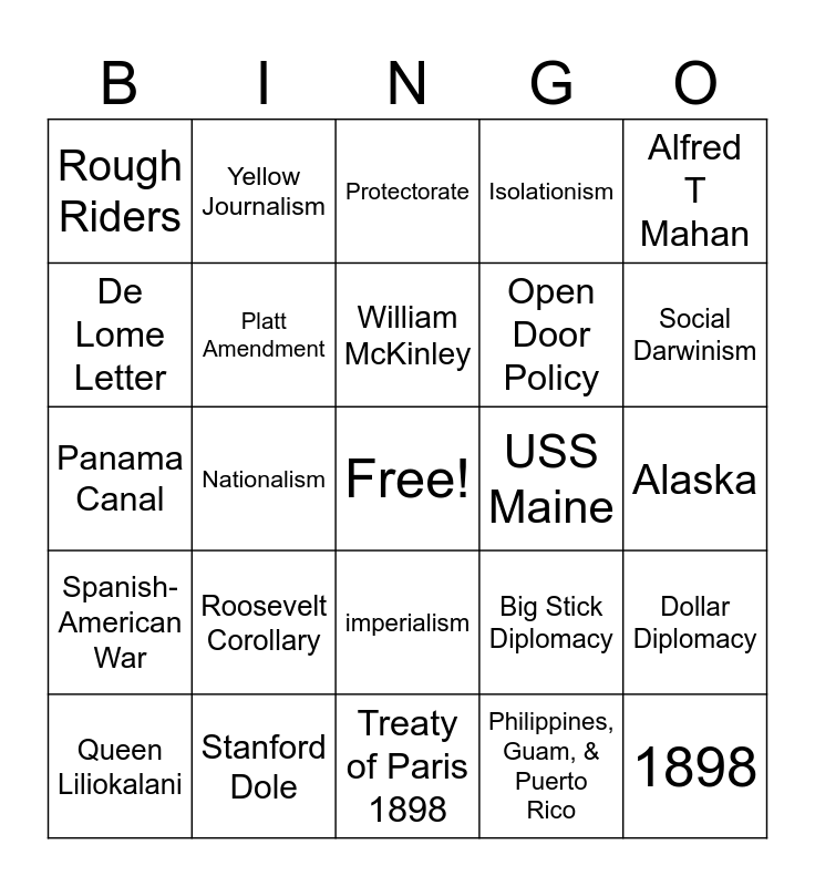This bingo card has a free space and 24 words: Roosevelt Corollary, Stanford Dole, William McKinley, Queen Liliokalani, Alfred T Mahan, Rough Riders, De Lome Letter, Yellow Journalism, USS Maine, imperialism, Open Door Policy, Panama Canal, Big Stick Diplomacy, Dollar Diplomacy, Platt Amendment, Philippines, Guam, & Puerto Rico, Alaska, Protectorate, Social Darwinism, Nationalism, 1898, Spanish-American War, Isolationism and Treaty of Paris 1898.