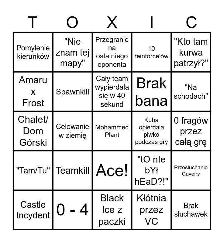 This bingo card has 25 words: "Tam/Tu", 0 - 4, Mohammed Plant, Kłótnia przez VC, "Kto tam kurwa patrzył?", Pomylenie kierunków, "Nie znam tej mapy", Przegranie na ostatniego oponenta, Kuba opierdala piwko podczas gry, Przesłuchanie Caveiry, Amaru x Frost, Spawnkill, Black Ice z paczki, "tO nIe bYł hEaD?!", "Na schodach", Castle Incydent, Celowanie w ziemię, Cały team wypierdala się w 40 sekund, Brak bana, 0 fragów przez całą grę, Chalet/ Dom Górski, Teamkill, Ace!, 10 reinforce'ów and Brak słuchawek.