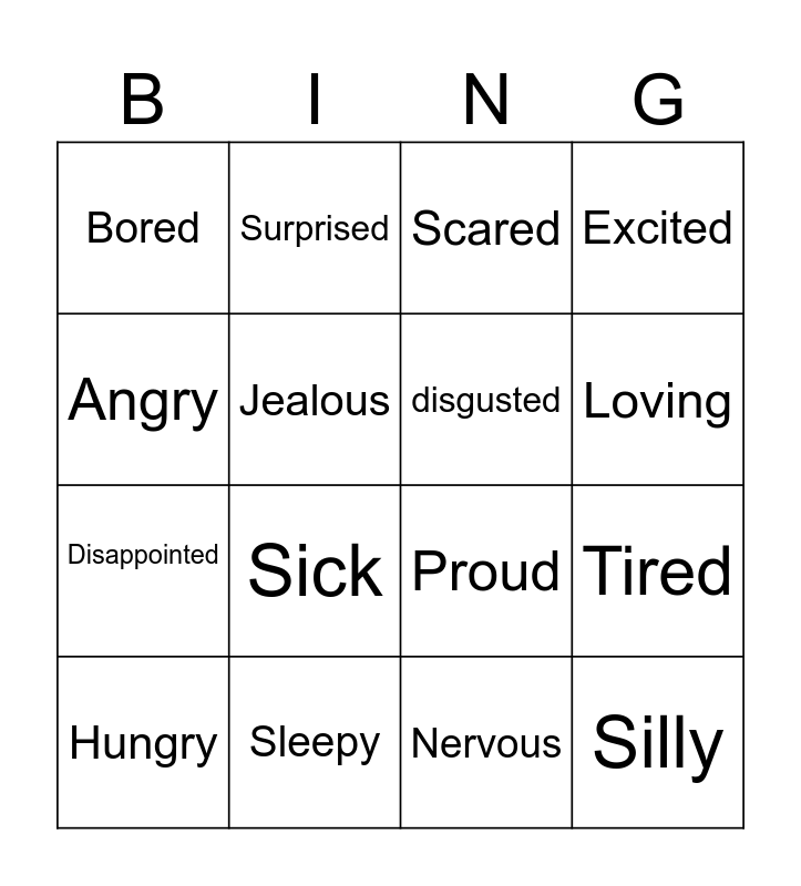 This bingo card has 16 words: Sleepy, Tired, Scared, Bored, Disappointed, Surprised, Proud, Nervous, Angry, Jealous, Hungry, Excited, Sick, Loving, disgusted and Silly.