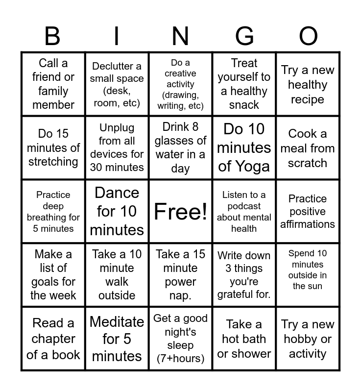 This bingo card has a free space and 24 words: Take a 10 minute walk outside, Meditate for 5 minutes, Drink 8 glasses of water in a day, Read a chapter of a book, Try a new healthy recipe, Call a friend or family member, Do 15 minutes of stretching, Declutter a small space (desk, room, etc), Listen to a podcast about mental health, Take a 15 minute power nap., Do 10 minutes of Yoga, Practice deep breathing for 5 minutes, Write down 3 things you're grateful for., Spend 10 minutes outside in the sun, Unplug from all devices for 30 minutes, Take a hot bath or shower, Practice positive affirmations, Do a creative activity (drawing, writing, etc), Cook a meal from scratch, Dance for 10 minutes, Try a new hobby or activity, Make a list of goals for the week, Treat yourself to a healthy snack and Get a good night's sleep (7+hours).