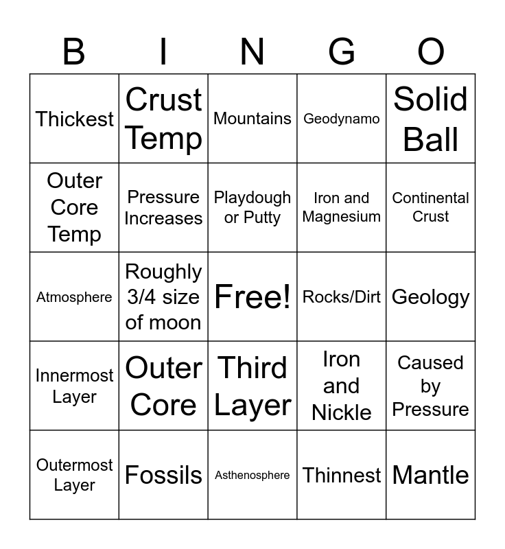 This bingo card has a free space and 49 words: Crust, Mantle, The Lithosphere, Asthenosphere, Outer Core, Inner Core, Crust Temp, Mantle Temp, Outer Core Temp, Inner Core Temp, Pressure Increases, Geodynamo, Caused by Pressure, Iron and Nickle, Rocks Record Earth's History, 4.6 Billion Years, Playdough or Putty, Rocks/Dirt, Liquid Soap/Hand Sanitizer, Solid Ball, Roughly 3/4 size of moon, Thinnest, Thickest, Iron and Magnesium, Oceanic Crust, Continental Crust, Outermost Layer, Second Layer, Third Layer, Innermost Layer, Asthenosphere and Lithosphere, Flow and Deform, Reversed Polarity, Compass to Point North, Fossils, Radiation, Constantly Changing, Earth Science, Geology, Continents, Oceans, Volcanoes, Earthquakes, Tsunamis, Atmosphere, Mountains, Canyons, Rivers and Plates.