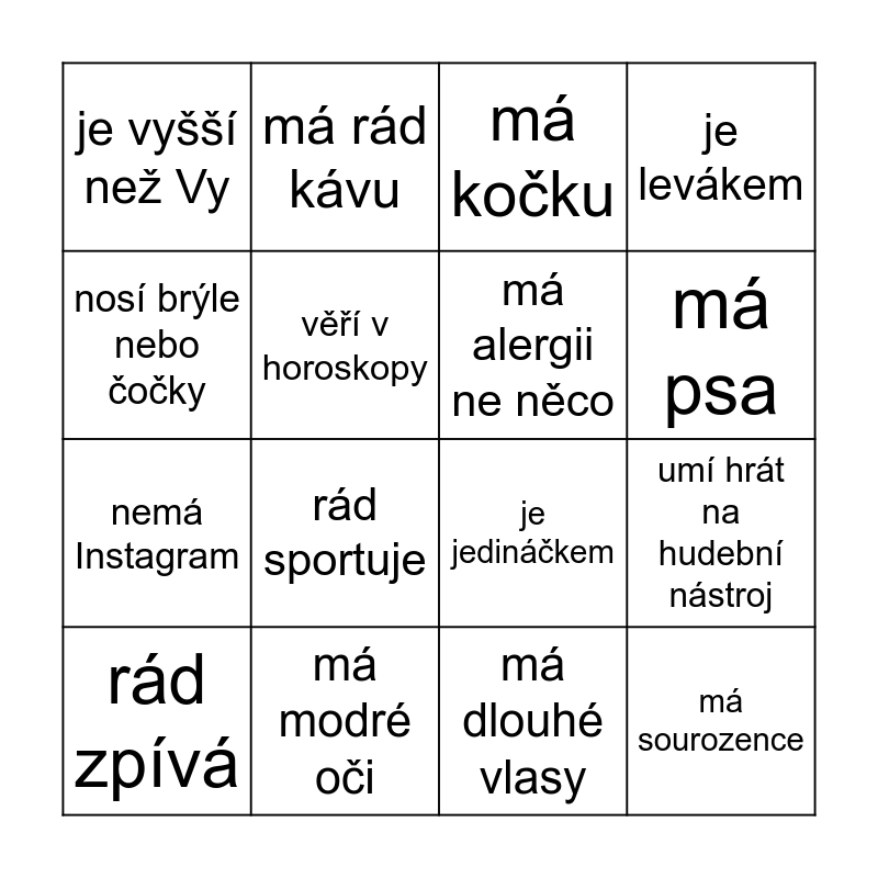This bingo card has 16 words: má modré oči, umí hrát na hudební nástroj, má kočku, je vyšší než Vy, nemá Instagram, má rád kávu, je jedináčkem, má dlouhé vlasy, nosí brýle nebo čočky, věří v horoskopy, rád zpívá, je levákem, rád sportuje, má psa, má alergii ne něco and má sourozence.
