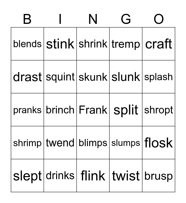 This bingo card has a free space and 34 words: blast, twist, grunt, stamp, shrimp, squint, craft, slept, stink, bring, skunk, shrink, drifts, scrap, split, splash, drinks, pranks, twend, slumps, blimps, plants, blends, shropt, flink, brusp, tremp, struss, slunk, drast, fland, brinch, flosk and twind.