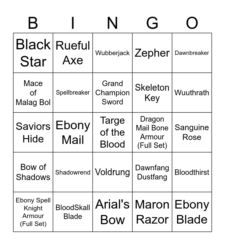 This bingo card has a free space and 24 words: Shadowrend, BloodSkall Blade, Grand Champion Sword, Ebony Spell Knight Armour (Full Set), Dawnbreaker, Black Star, Mace of Malag Bol, Rueful Axe, Dragon Mail Bone Armour (Full Set), Voldrung, Skeleton Key, Saviors Hide, Dawnfang Dustfang, Bloodthirst, Spellbreaker, Maron Razor, Sanguine Rose, Wubberjack, Wuuthrath, Ebony Mail, Ebony Blade, Bow of Shadows, Zepher and Arial's Bow.