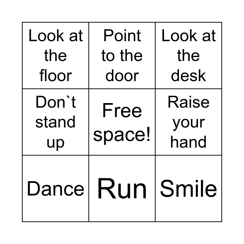 This bingo card has a free space and 25 words: Stand up, Open your book, Run, Pick up your pencil, Smile, Look at the floor, Raise your hand, Point to the door, Touch your nose, Sing, Jump, Sit down, Walk, Turn around, Dance, Laugh, Pick up your book, Look at the desk, Raise your leg, Touch your knee, Touch your ear, Close your book, Cry, Don`t stand up and Go ahead.