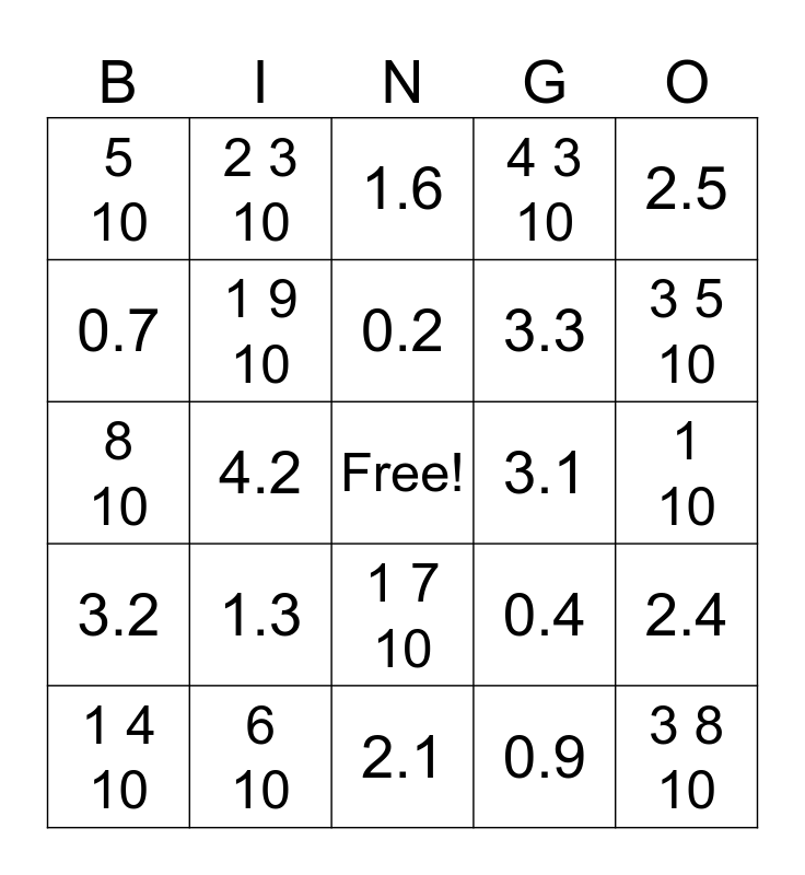 This bingo card has a free space and 24 words: 1.3, 6 10, 0.2, 1 4 10, 2.5, 5 10, 0.7, 2 3 10, 3.1, 1 7 10, 3.3, 8 10, 0.4, 2.4, 1 9 10, 0.9, 1 10, 1.6, 3 5 10, 4.2, 3 8 10, 3.2, 4 3 10 and 2.1.