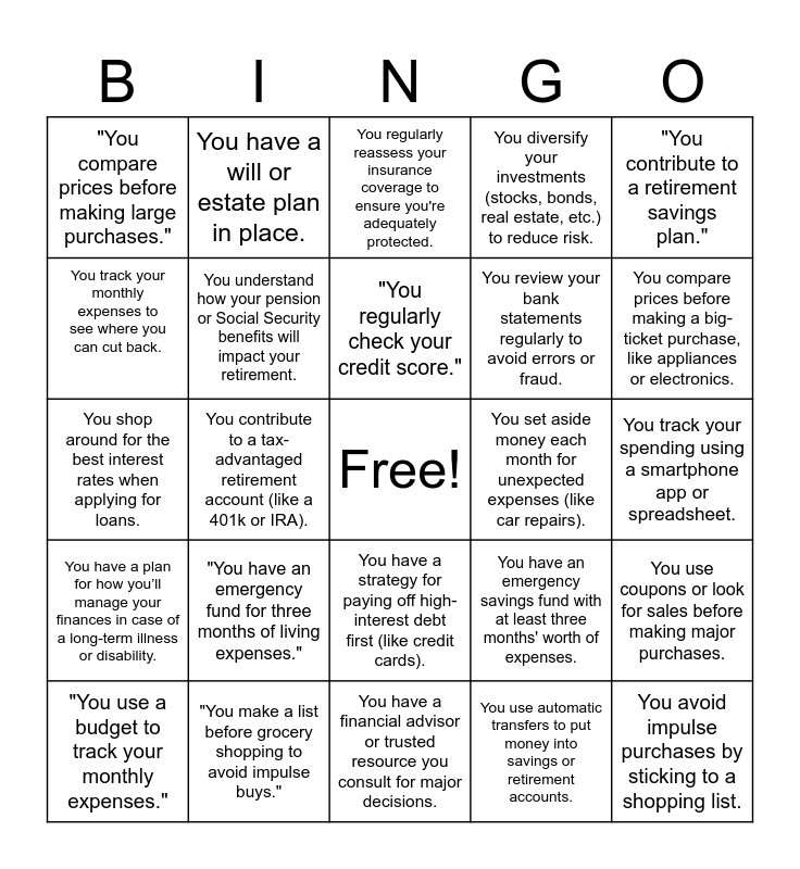 This bingo card has a free space and 24 words: "You have an emergency fund for three months of living expenses.", "You make a list before grocery shopping to avoid impulse buys.", "You regularly check your credit score.", "You use a budget to track your monthly expenses.", "You contribute to a retirement savings plan.", "You compare prices before making large purchases.", You track your monthly expenses to see where you can cut back., You have a will or estate plan in place., You set aside money each month for unexpected expenses (like car repairs)., You have a strategy for paying off high-interest debt first (like credit cards)., You review your bank statements regularly to avoid errors or fraud., You shop around for the best interest rates when applying for loans., You have an emergency savings fund with at least three months' worth of expenses., You use coupons or look for sales before making major purchases., You understand how your pension or Social Security benefits will impact your retirement., You use automatic transfers to put money into savings or retirement accounts., You track your spending using a smartphone app or spreadsheet., You regularly reassess your insurance coverage to ensure you're adequately protected., You compare prices before making a big-ticket purchase, like appliances or electronics., You contribute to a tax-advantaged retirement account (like a 401k or IRA)., You avoid impulse purchases by sticking to a shopping list., You have a plan for how you’ll manage your finances in case of a long-term illness or disability., You diversify your investments (stocks, bonds, real estate, etc.) to reduce risk. and You have a financial advisor or trusted resource you consult for major decisions..