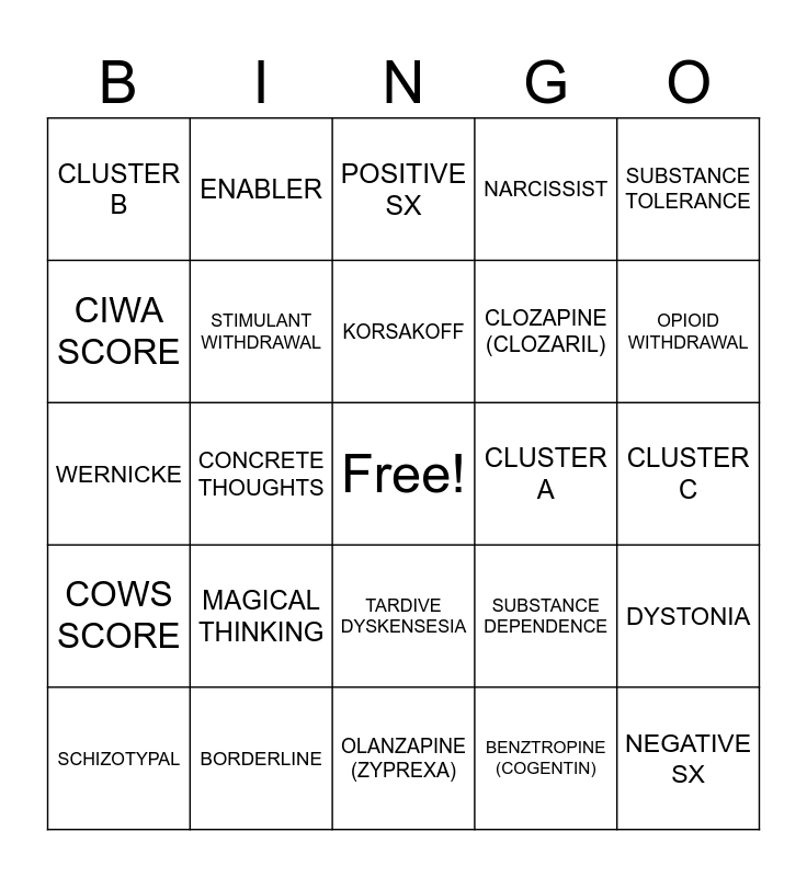 This bingo card has a free space and 29 words: SCHIZOTYPAL, ALCOHOL WITHDRAWAL, CONCRETE THOUGHTS, ANTISOCIAL, CLUSTER B, POSITIVE SX, STIMULANT WITHDRAWAL, MAGICAL THINKING, CLUSTER A, BORDERLINE, CLUSTER C, NEGATIVE SX, OLANZAPINE (ZYPREXA), BENZTROPINE (COGENTIN), OPIOID WITHDRAWAL, DELERIUM TREMENS, TARDIVE DYSKENSESIA, COWS SCORE, SUBSTANCE TOLERANCE, WERNICKE, SUBSTANCE DEPENDENCE, HALOPERIDOL (HALDOL), CLOZAPINE (CLOZARIL), CIWA SCORE, NARCISSIST, ENABLER, DYSTONIA, KORSAKOFF and CAGE QUESTIONS.