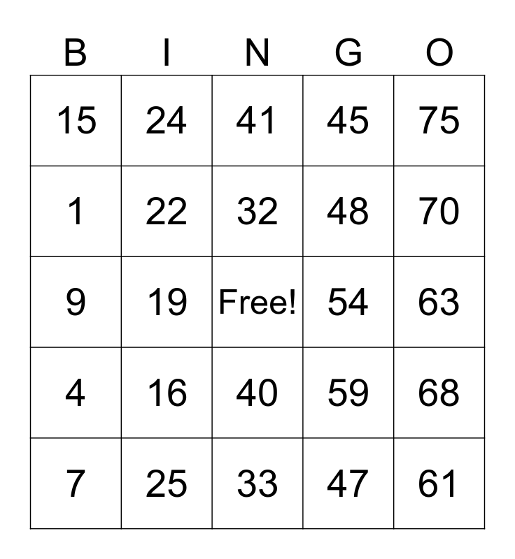 This bingo card has a free space and 24 words: 7, 16, 32, 47, 75, 15, 24, 41, 54, 63, 9, 22, 59, 68, 1, 25, 33, 45, 70, 4, 19, 40, 48 and 61.