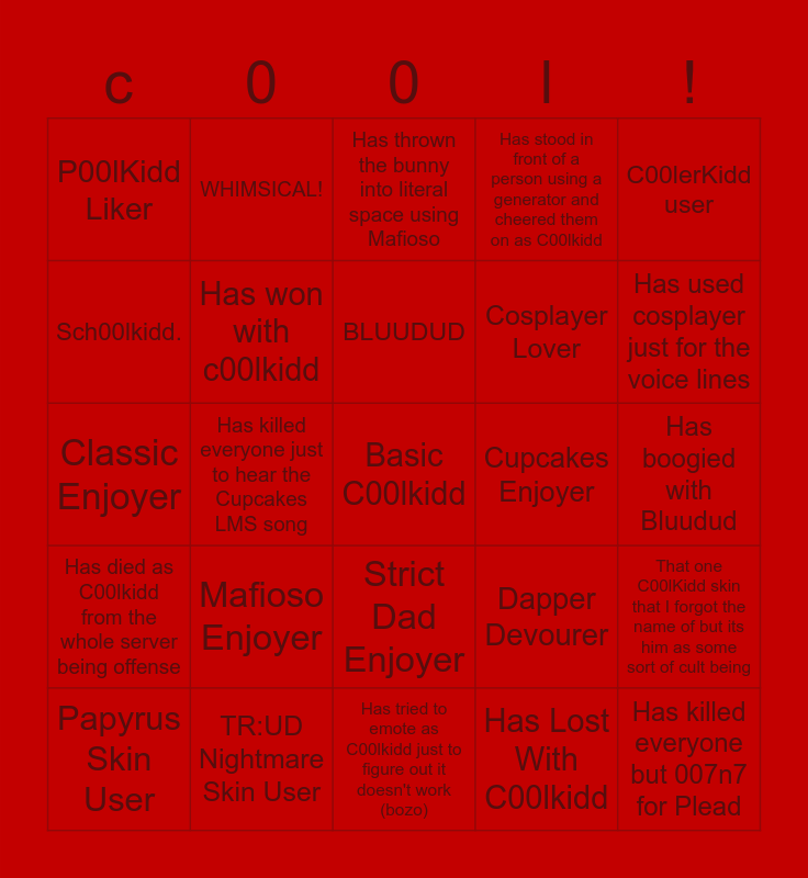 This bingo card has a free space and 24 words: Mafioso Enjoyer, TR:UD Nightmare Skin User, BLUUDUD, Papyrus Skin User, C00lerKidd user, P00lKidd Liker, Sch00lkidd., WHIMSICAL!, Cupcakes Enjoyer, Strict Dad Enjoyer, Cosplayer Lover, Classic Enjoyer, Dapper Devourer, That one C00lKidd skin that I forgot the name of but its him as some sort of cult being, Has won with c00lkidd, Has Lost With C00lkidd, Has boogied with Bluudud, Has thrown the bunny into literal space using Mafioso, Has used cosplayer just for the voice lines, Has killed everyone just to hear the Cupcakes LMS song, Has killed everyone but 007n7 for Plead, Has died as C00lkidd from the whole server being offense, Has stood in front of a person using a generator and cheered them on as C00lkidd and Has tried to emote as C00lkidd just to figure out it doesn't work (bozo).