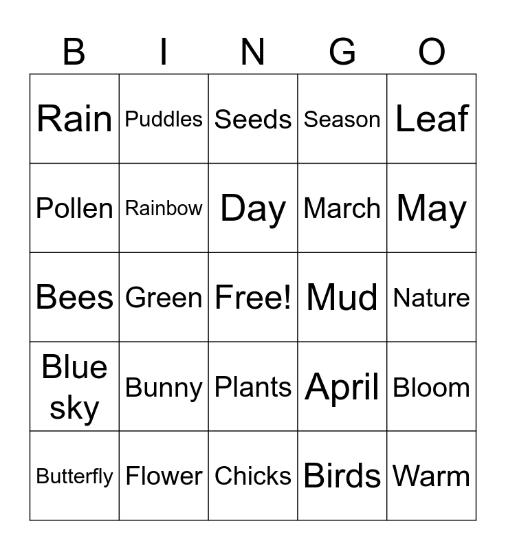 This bingo card has a free space and 29 words: Spring, Flower, Seeds, Sunshine, Leaf, Rain, Rainbow, Day, Mud, Bloom, Butterfly, Green, Birds, Warm, Bees, Blossom, Chicks, April, May, Blue sky, Bunny, Grass, March, Nature, Pollen, Puddles, Plants, Season and Daylight.