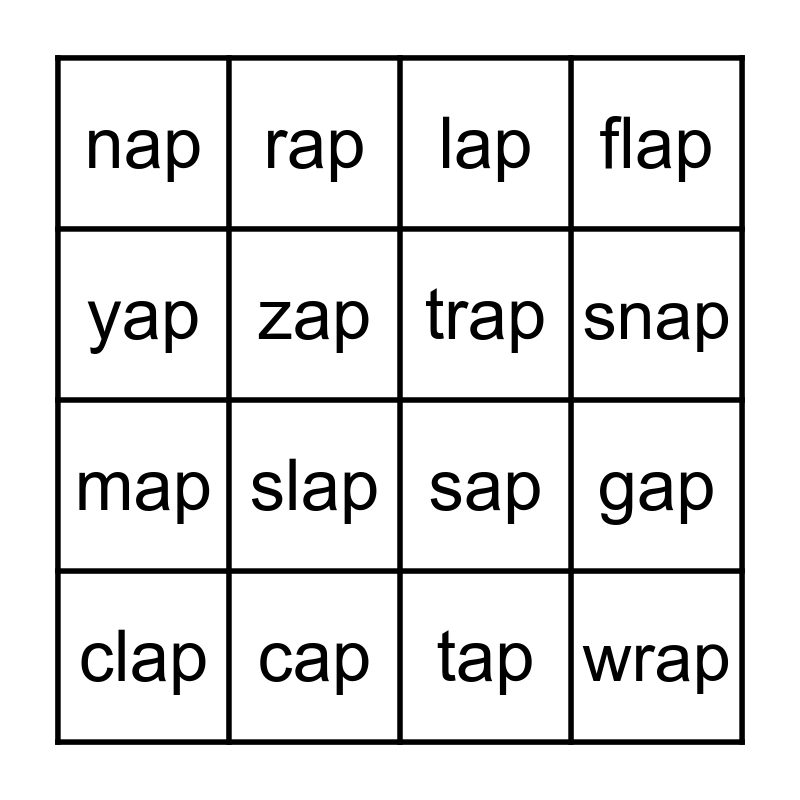 This bingo card has 16 words: cap, gap, lap, nap, map, rap, sap, tap, yap, zap, clap, flap, slap, snap, trap and wrap.