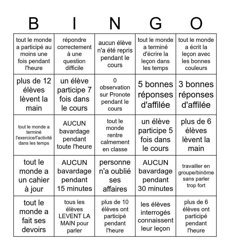 This bingo card has a free space and 24 words: AUCUN bavardage pendant 15 minutes, tous les élèves LEVENT LA MAIN pour parler, 0 observation sur Pronote pendant le cours, tout le monde a fait ses devoirs, tout le monde a écrit la leçon avec les bonnes couleurs, tout le monde a participé au moins une fois pendant l'heure, plus de 12 élèves lèvent la main, répondre correctement à une question difficile, un élève participe 5 fois dans le cours, personne n'a oublié ses affaires, 5 bonnes réponses d'affilée, tout le monde a terminé l'exercice/l'activité dans les temps, AUCUN bavardage pendant 30 minutes, travailler en groupe/binôme sans parler trop fort, un élève participe 7 fois dans le cours, les élèves interrogés connaissent leur leçon, plus de 6 élèves lèvent la main, aucun élève n'a été repris pendant le cours, 3 bonnes réponses d'affilée, AUCUN bavardage pendant toute l'heure, plus de 6 élèves ont participé pendant l'heure, tout le monde a un cahier à jour, tout le monde a terminé d'écrire la leçon dans les temps and plus de 10 élèves ont participé pendant l'heure.