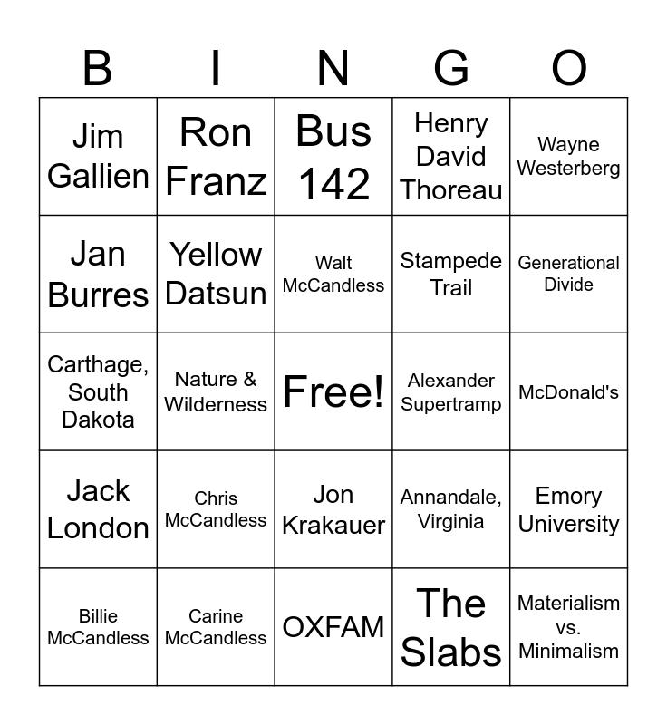 This bingo card has a free space and 24 words: Chris McCandless, Carine McCandless, Walt McCandless, Billie McCandless, Wayne Westerberg, Jim Gallien, Jan Burres, Ron Franz, Alexander Supertramp, Jon Krakauer, Stampede Trail, Carthage, South Dakota, Annandale, Virginia, Emory University, Yellow Datsun, The Slabs, McDonald's, Bus 142, Generational Divide, Nature & Wilderness, Materialism vs. Minimalism, Jack London, Henry David Thoreau and OXFAM.