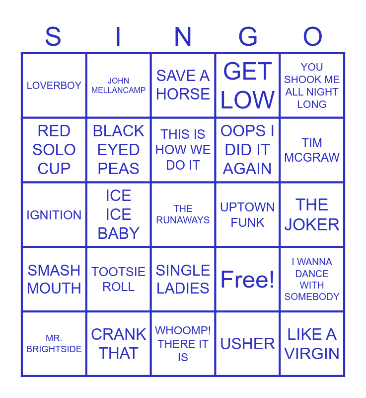 This bingo card has 25 words: TOOTSIE ROLL, WHOOMP! THERE IT IS, THIS IS HOW WE DO IT, MR. BRIGHTSIDE, YOU SHOOK ME ALL NIGHT LONG, LOVERBOY, RED SOLO CUP, JOHN MELLANCAMP, UPTOWN FUNK, SINGLE LADIES, OOPS I DID IT AGAIN, IGNITION, Free!, I WANNA DANCE WITH SOMEBODY, BLACK EYED PEAS, LIKE A VIRGIN, THE JOKER, SAVE A HORSE, TIM MCGRAW, ICE ICE BABY, THE RUNAWAYS, CRANK THAT, SMASH MOUTH, GET LOW and USHER.