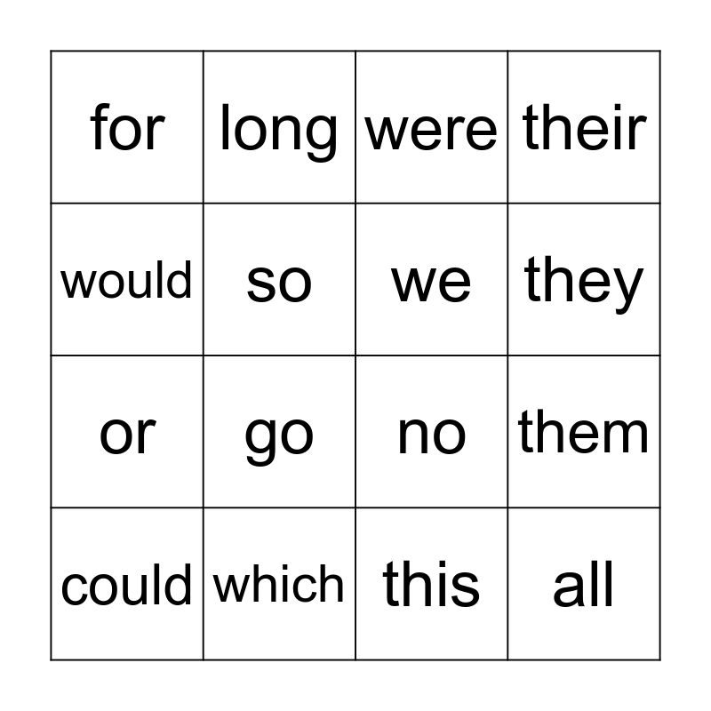 This bingo card has 20 words: them, than, were, with, could, would, which, for, or, long, go, no, so, all, we, she, they, their, this and that.