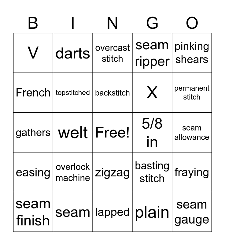 This bingo card has a free space and 24 words: overlock machine, seam, backstitch, seam finish, pinking shears, V, French, darts, 5/8 in, zigzag, X, gathers, basting stitch, fraying, topstitched, plain, seam allowance, overcast stitch, permanent stitch, welt, seam gauge, easing, seam ripper and lapped.