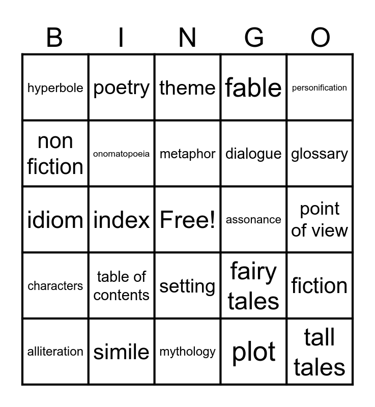 This bingo card has a free space and 24 words: table of contents, simile, metaphor, alliteration, personification, hyperbole, non fiction, poetry, assonance, setting, dialogue, idiom, fairy tales, fiction, onomatopoeia, plot, point of view, theme, glossary, index, tall tales, characters, fable and mythology.