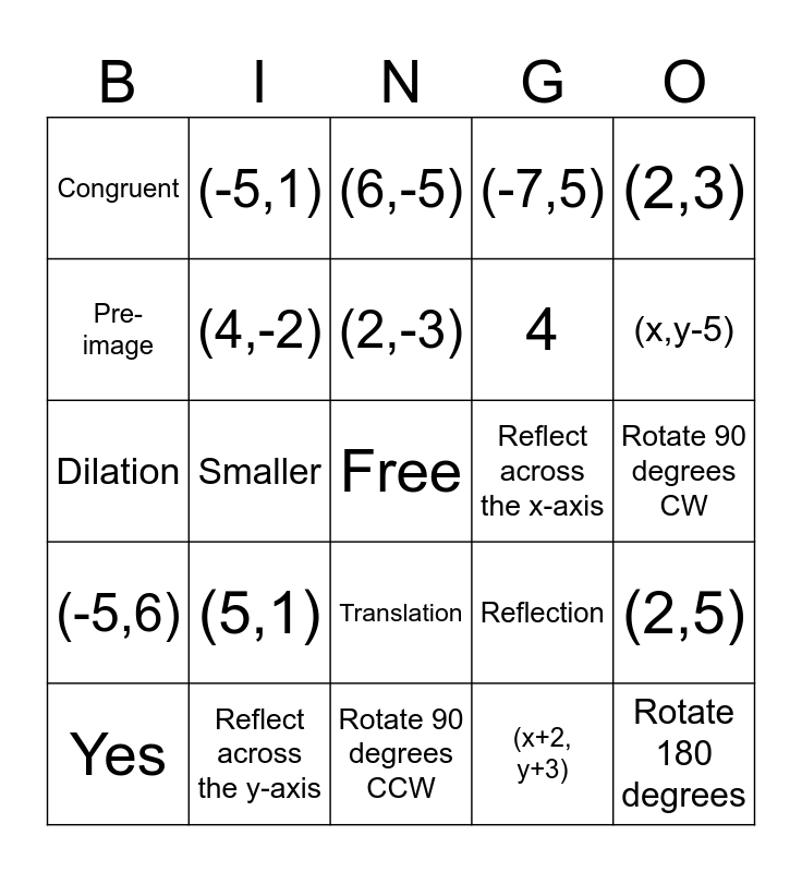 This bingo card has a free space and 29 words: Yes, No, Smaller, False, Congruent, (6,-5), (4,-2), (5,1), Reflect across the x-axis, Reflect across the y-axis, Rotate 90 degrees CW, Rotate 180 degrees, Rotate 90 degrees CCW, (x+2, y+3), (x,y-5), (x-3, y+4), Translation, (-5,6), (2,3), Dilation, Reflection, Rotation, 4, Pre-image, (-7,5), (-5,1), (2,5), (2,-3) and y-coordinate.