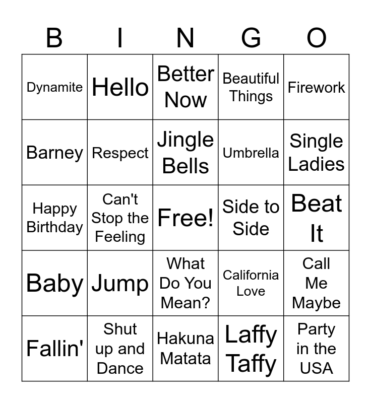 This bingo card has a free space and 75 words: Bad Blood, Say my Name, Better Now, Shake it Off, Girls just wanna have fun, Roar, Dilemma, Watermelon Sugar, YMCA, All About that Bass, Fast Car, Macarena, Jingle Bells, Barney, We Will Rock You, Can't Stop the Feeling, Uptown Funk, Party in the USA, OMG, Firework, U Can't Touch This, Happy Birthday, Respect, Hello, Beautiful Things, Let it Go, Girl on Fire, Espresso, Hokey Pokey, Old Town Road, Watch Me, Who Let the Dogs Out, Havana, California Love, Single Ladies, Umbrella, Your Love is My Drug, Diamonds, Beat It, Laffy Taffy, God Taught Me, Ride Wit Me, Good Day, Ain't No Sunshine, I Really Like You, Wrecking Ball, Fallin', Dynamite, Lean On Me, My House, Turn Down for What, What Do You Mean?, At Last, I Wanna Dance with Somebody, What Make you Beautiful, Stayin' Alive, Dora the Explorer, Star Spangled Banner, You are my Sunshine, Eye of the Tiger, Jump, ABCs, Baby One More Time, Fight Song, Row your Boat, Side to Side, All I Want for Xmas, Celebration, 9 to 5, Call Me Maybe, Baby, Shut up and Dance, Don't Worry Be Happy, Hakuna Matata and Yeah.